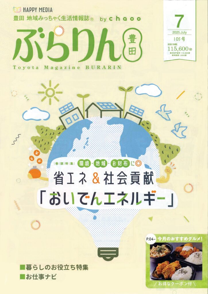 2025/07/01豊田市の地域密着生活情報誌「ぶらりん豊田」2025年7月号(105号)にて、おいでんエネルギーを巻頭特集していただきました!