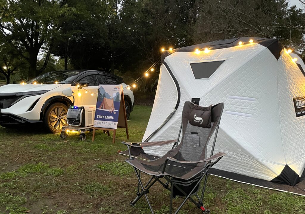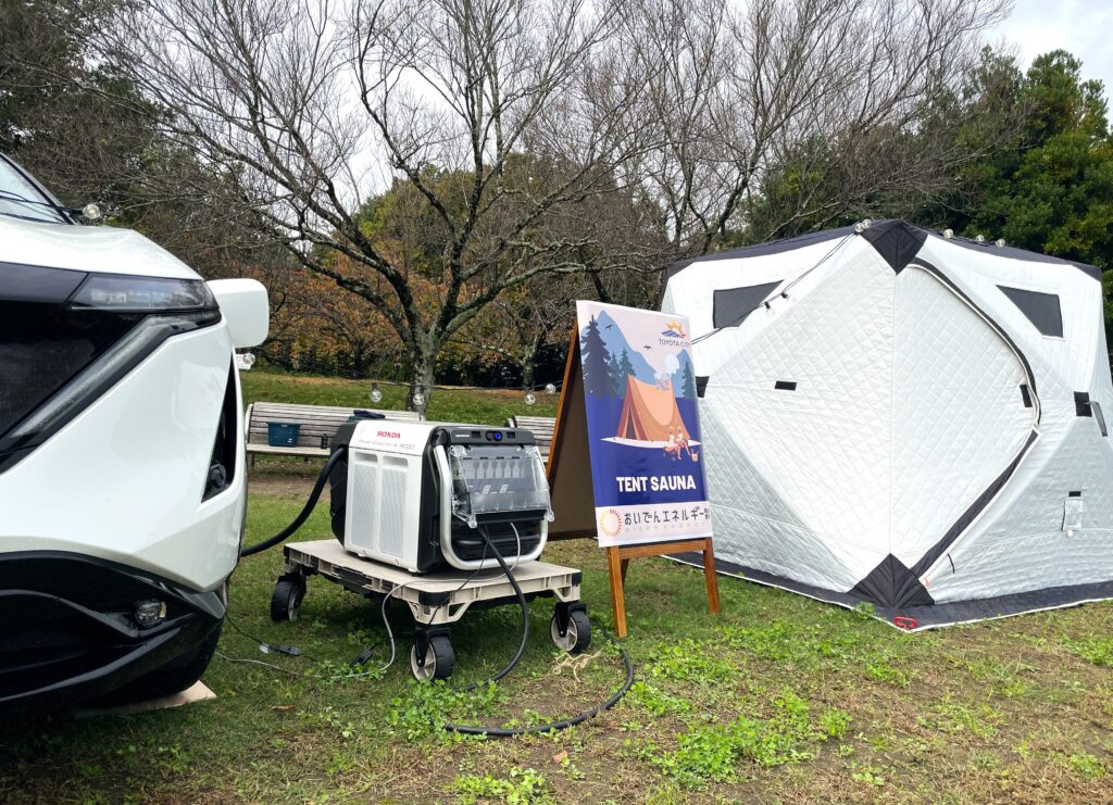 おいでんエネルギーは、電気自動車(EV)の電気を活用したテントサウナの出展を行いました。