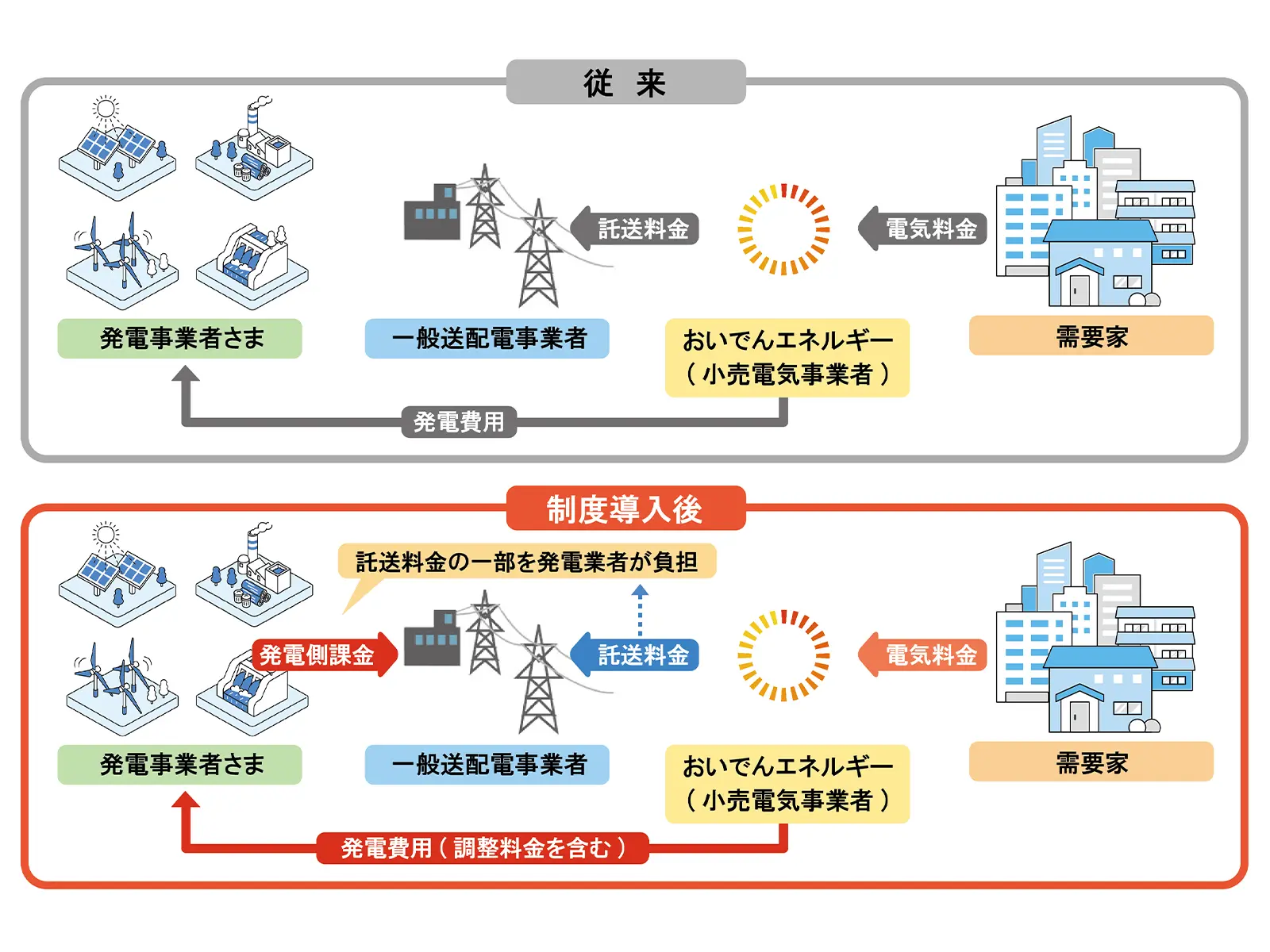 ・国の審議会で定められました発電側課金制度は、系統の効率利用とともに、再生可能エネルギーの導入拡大などに向けた送配電設備の維持・拡充を効率的かつ確実におこなう観点から、系統連系・維持の対価として一般送配電事業者である中部電力パワーグリッド株式会社へ支払う託送料金の一部を系統利用者である発電者さまに直接ご負担いただく制度で、2024年4月1日から導入されます。